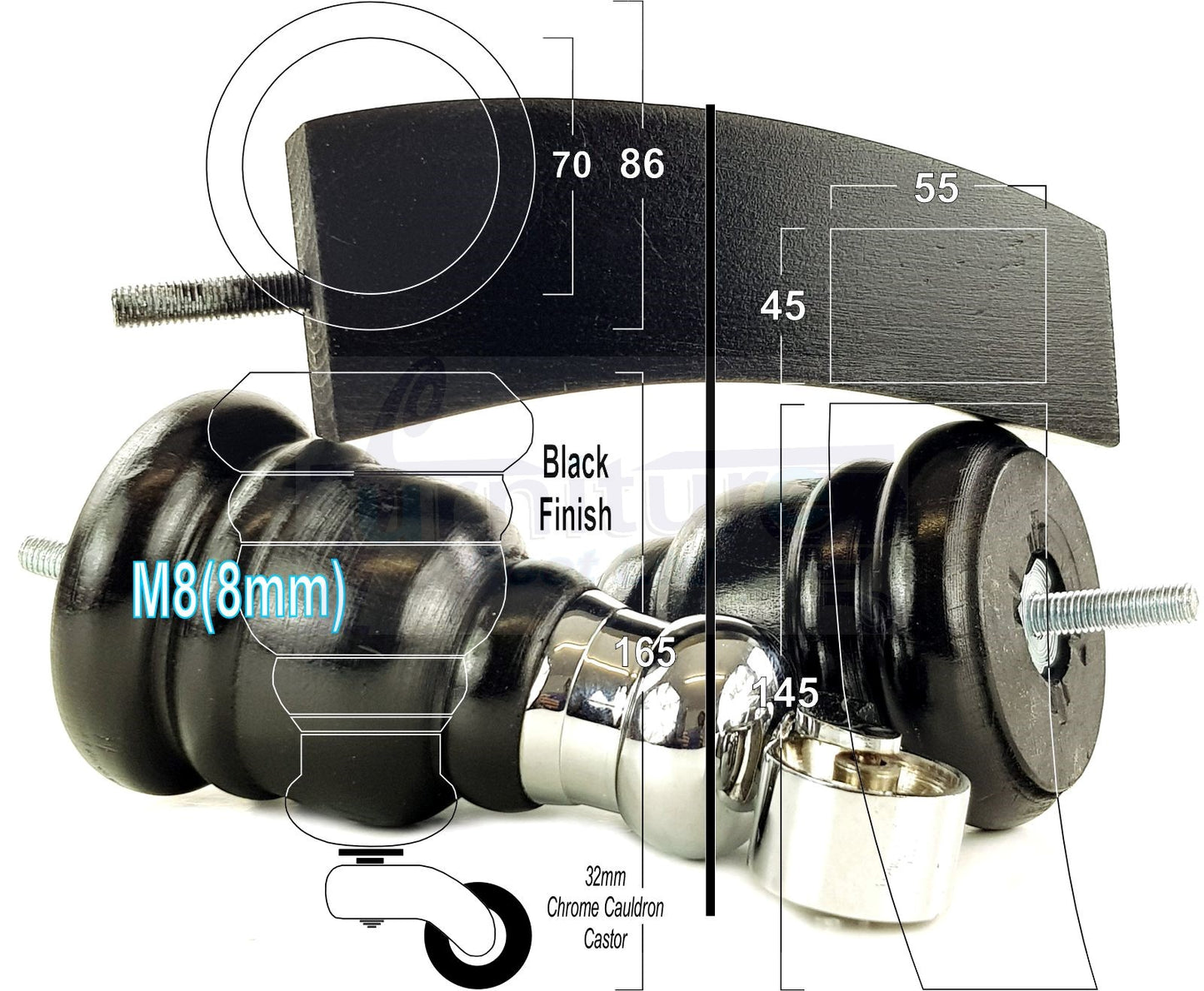Black Turned Wood Furniture Feet 2 With Castors 155mm and 2 Curved Back Legs Sofas Chairs Stools Cabinets Beds M8 6 Inches