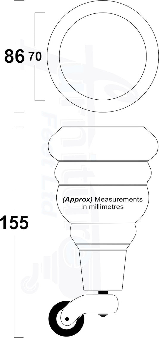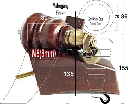 2 Turned Wood Furniture Feet With Castors 155mm Antique Brown Stain Legs Sofas Chairs Stools Cabinets Beds M8 6 Inches